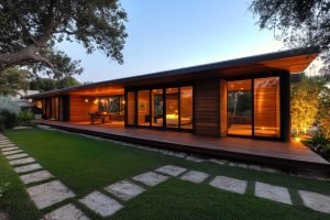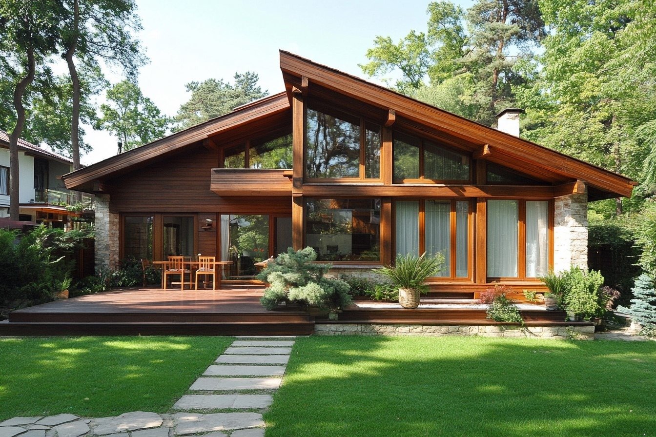 المنزل الخشبي الحديث يجمع بين الحرفية التقليدية في استخدام الخشب وبين عناصر التصميم المعاصر مثل النوافذ الكبيرة، والتقسيمات المفتوحة، والوسائل الحديثة للراحة